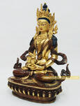 In this 8” Aparmita Sculpture Aparmita is seated like Buddha and his hands lie on his lap in Dhyana Mudra holding the ambrosia vase, his special emblem. The vase is richly decorated and from the cover fall four strings of beads which represent sacred pills. Aparmita wears the thirteen ornaments and his hair is painted blue and falls on either side to his elbows or may be curiously coiled.