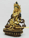 Aparmita is the name given to Amitabha in his character of bestower of longevity. Aparmita may be turned either a “Crowned Buddha or a Bodhisattva and is therefore richly clad and wears the thirteen ornaments. His hair is painted blue and falls on either side to his elbows or may be curiously coiled. Aparmita is seated like Buddha and his hands lie on his lap in Dhyana Mudra holding the ambrosia vase, his special emblem. The vase is richly decorated and from the cover fall four strings of beads which represent sacred pills. In the preliminary worship, the pills made from buttered dough and the ambrosia brewed from spirit or beer and offered in a skull bowl to the great image of Aparmita. The lama then places a vajra on the ambrosia vase, which the image of Amitayus holds in its lap, and applies a cord, which is attached to the vajra, his own heart. The wine in the ambrosia vase is then consecrated and the people partake of it as well as of the sacred pills with the firm conviction that there lives will be prolonged through their faith in Aparmita.