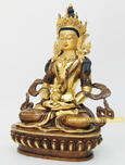 Aparmita is the name given to Amitabha in his character of bestower of longevity. Aparmita may be turned either a “Crowned Buddha or a Bodhisattva and is therefore richly clad and wears the thirteen ornaments. His hair is painted blue and falls on either side to his elbows or may be curiously coiled. Aparmita is seated like Buddha and his hands lie on his lap in Dhyana Mudra holding the ambrosia vase, his special emblem. The vase is richly decorated and from the cover fall four strings of beads which represent sacred pills. In the preliminary worship, the pills made from buttered dough and the ambrosia brewed from spirit or beer and offered in a skull bowl to the great image of Aparmita. The lama then places a vajra on the ambrosia vase, which the image of Amitayus holds in its lap, and applies a cord, which is attached to the vajra, his own heart. The wine in the ambrosia vase is then consecrated and the people partake of it as well as of the sacred pills with the firm conviction that there lives will be prolonged through their faith in Aparmita.