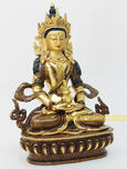 In this 8.5” Aparmita Sculpture Aparmita is seated like Buddha and his hands lie on his lap in Dhyana Mudra holding the ambrosia vase, his special emblem. The vase is richly decorated and from the cover fall four strings of beads which represent sacred pills. Aparmita wears the thirteen ornaments and his hair is painted blue and falls on either side to his elbows or may be curiously coiled.