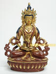 Aparmita is the name given to Amitabha in his character of bestower of longevity. Aparmita may be turned either a “Crowned Buddha or a Bodhisattva and is therefore richly clad and wears the thirteen ornaments. His hair is painted blue and falls on either side to his elbows or may be curiously coiled. Aparmita is seated like Buddha and his hands lie on his lap in Dhyana Mudra holding the ambrosia vase, his special emblem. The vase is richly decorated and from the cover fall four strings of beads which represent sacred pills. In the preliminary worship, the pills made from buttered dough and the ambrosia brewed from spirit or beer and offered in a skull bowl to the great image of Aparmita. The lama then places a vajra on the ambrosia vase, which the image of Amitayus holds in its lap, and applies a cord, which is attached to the vajra, his own heart. The wine in the ambrosia vase is then consecrated and the people partake of it as well as of the sacred pills with the firm conviction that there lives will be prolonged through their faith in Aparmita.