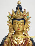 This 8” Partially Gold Gilded Aparmita Sculpture is made from Copper Alloy with Partially Gold Gilded Statue and decorated with colorful semiprecious stones which is crafted by our experienced artisan of Patan, Nepal who has been in this business from generations.