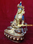In this 8.5” Aparmita Sculpture Aparmita is seated like Buddha and his hands lie on his lap in Dhyana Mudra holding the ambrosia vase, his special emblem. The vase is richly decorated and from the cover fall four strings of beads which represent sacred pills. Aparmita wears the thirteen ornaments and his hair is painted blue and falls on either side to his elbows or may be curiously coiled.