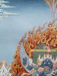 The Hayagriva’s terrific appearance is directed towards ego grasping and outer obstructions. His wrathfulness is said to be fierce compassion directed towards self cherishing attitude. According to Sadhanamala, Hayagriva is red in color. Hayagriva is awesome and terrible in appearance with bare fangs. Hayagriva has three eyes and brown beard. Hayagriva wears a garland of skull with teeth and lips. Hayagriva is crowned with his Jata and a figure of Amitabha. His second face is that of a horse, which is blue in color and neighs continuously. Hayagriva tramples on the top of the world. Hayagriva wears the snake ornaments.