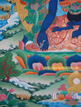 This beautiful 25.5” x 19.5” Medicine Buddha Tibetan Thangka Painting has his left hand, lying in his lap in ‘Meditation’ Mudra, which holds a bowl containing medicine nuts, while his right hand is in ‘Charity’ Mudra which holds the branch of the Myrobalan plant, a medicinal plant found in Nepal, India and other tropical countries. Medicine Buddha wears the monastic robe and is seated with the legs crossed. Medicine Buddha sits on a moon disk on lotus petals.