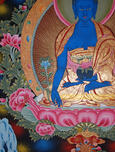This beautiful 23” x 18.3” Medicine Buddha Tibetan Thangka Painting has his left hand, lying in his lap in ‘Meditation’ Mudra, which holds a bowl containing medicine nuts, while his right hand is in ‘Charity’ Mudra which holds the branch of the Myrobalan plant, a medicinal plant found in Nepal, India and other tropical countries. Medicine Buddha wears the monastic robe and is seated with the legs crossed. Medicine Buddha sits on a moon disk on lotus petals.