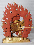 Hayagriva is also one of the main archetype deities of the Nyingma Order. Hayagriva is one of the emanations of Bodhisattva Avalokiteshvara in terrific form. Hayagriva has many forms often with three faces, six arms, and four legs, and sometimes with huge wings. Hayagriva can be recognized by a small horse head surmounted on the top of his main terrific head and gives him the name Hayagriva, 'Horse-necked One.' The horse head neighs very loudly and the sound is said to pierce all the false appearance inherent in existence or substantial reality. Hayagriva’s hair is disheveled and protruding from the horse head. Hayagriva wears a crown of skulls and under a belt of skulls hangs a tiger skin. Hayagriva’s symbols are the thunderbolt, trident, lasso, etc.