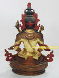 In this 8.5” Sculpture Aparmita is shown in his popular posture with his Consort. Aparmita is seated like Buddha and his hands lie on his lap in Dhyana Mudra holding the ambrosia vase, his special emblem. The vase is richly decorated and from the cover fall four strings of beads which represent sacred pills. Aparmita wears the thirteen ornaments and his hair is painted blue and falls on either side to his elbows or may be curiously coiled.