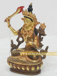 Beautifully Hand Carved Copper Alloy With 24 Karat Partially Gold Gilded Manjushri Copper Statue or Sculpture is carved in Patan, Nepal. This 5” Copper Alloy Manjushri Sculpture with Partially Gold Gilded is beautifully hand carved Copper Statue.