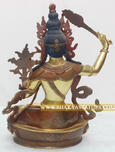Beautifully Hand Carved Copper Alloy With 24 Karat Partially Gold Gilded Manjushri Copper Statue or Sculpture is carved in Patan, Nepal. This 8.8” Copper Alloy Manjushri Sculpture with Partially Gold Gilded is beautifully hand carved Copper Statue.