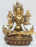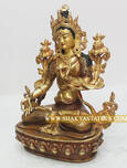 This beautifully hand carved 8.5” White Tara Sculpture is made from the copper with 24 K Partially Gold Gilded is made by the artisan of Patan, Nepal, here White Tara is in seated on a lotus base in Lalitasana posture.