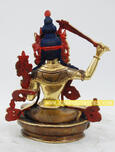 Manjushri is known as the Bodhisattva of Wisdom and is the bodhisattva counterpart to Adi Buddha (Thogmai Sangye), the Primordial Buddha. Manjushri is the tutelary deity of astrology and generally the protector of students. Manjushri is often considered to be the Buddha's incarnate wisdom. In his right hand Manjushri holds the flaming double sword of analytic discrimination to annihilate ignorance, the fundamental cause of cyclic existence and suffering. The left hand holds a blue lotus surmounted by the book of transcendent wisdom, the Prajnaparamita sutra. Manjushri is surrounded by over a hundred similar golden manifestations, symbolizing the universality of the Bodhisattva of Wisdom. Manjushri, whose worship confers mastery of the Dharma and he is considered the founder of Kathmandu. Originally, the Kathmandu valley was a lake where Vipaswi Buddha threw some lotus seeds. One of these seeds grew into a thousand petalled lotus flower from which shone a five colored light representing the five Buddhas. With his flaming sword of wisdom, Manjushri cut through the valley walls and the light came to rest on the peak at Swayambhu.