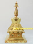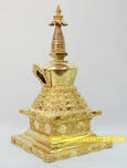 Fully Gold Gilded 7.5” Stupa or Chorten made from Copper is beautifully carved with beautiful carvings crafted by the master artisans of Patan, Nepal. |