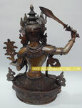 Manjushri is known as the Bodhisattva of Wisdom and is the bodhisattva counterpart to Adi Buddha (Thogmai Sangye), the Primordial Buddha. Manjushri is the tutelary deity of astrology and generally the protector of students. Manjushri is often considered to be the Buddha's incarnate wisdom. In his right hand Manjushri holds the flaming double sword of analytic discrimination to annihilate ignorance, the fundamental cause of cyclic existence and suffering. The left hand holds a blue lotus surmounted by the book of transcendent wisdom, the Prajnaparamita sutra. Manjushri is surrounded by over a hundred similar golden manifestations, symbolizing the universality of the Bodhisattva of Wisdom. Manjushri, whose worship confers mastery of the Dharma and he is considered the founder of Kathmandu. Originally, the Kathmandu valley was a lake where Vipaswi Buddha threw some lotus seeds. One of these seeds grew into a thousand petalled lotus flower from which shone a five colored light representing the five Buddhas. With his flaming sword of wisdom, Manjushri cut through the valley walls and the light came to rest on the peak at Swayambhu.