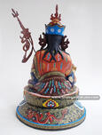 In this 15.25” Guru Rinpoche Sculpture, Guru Rinpoche embodies the ultimate attainment of the Vajrayana and the power, both temporal and spiritual, associated with this peerless attainment. These powerful attributes show Guru Rinpoche wearing an expression of great force and concentration while holding various implements of power such as the Vajra scepter, skull – cup and trident staff called Kathvanga. His right hand brandishes a Vajra, while the left hand, resting on his lap, supports the Vase of immortality. Guru Rinpoche is dressed not only in the robes of a monk but also in the garments of a king to indicate that Guru Rinpoche is a member of both worldly and religious royalty. |