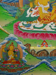 Yellow Jambhala (Tibetan: Jambhala Serpo): The God of Wealth, he is the manifestation of Buddha Ratnasambhava. This is the yellow Jambhala, yellow in color; he is adorned with a crown, jewel and gold ornaments and silk garments, seated imperially in the center of the multi-colored lotus throne, stepped on a white conch shell. With left hand in the stoat a jewel keeping in mouth and right hand the morni of gush of flame on the right knee, with the jewel earring and jewel necklace, he is exposing his chest and abdomen, the aura and lucky cloud surrounded on the sides.
