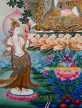 Guru Padmasambhava also Guru Rinpoche, the Precious Master — is revered throughout the Himalayan ranges as a Second Buddha. Invited from India in the eighth century to subjugate the forces inhibiting the spread of Shakyamuni's teachings, Guru Rinpoche managed to transform hitherto hostile powers into guardians and protectors of the pure dharma and, in the process, left an indelible mark on the entire Himalayan region. In quite a literal sense, Guru Rinpoche's mark is to be found throughout the Himalayan ranges in and around the many caves Guru Rinpoche used for meditation. At these sites one can still see handprints and footprints of the Precious Master impressed into solid rock, mute testimony to the extraordinary power this fully accomplished yogi and tantric magician exercised over the external and internal elements. Now, in the pure depth of the heavens, Vajrasattva, allowing the Metamorphic Body to be seen, seared upon an elephant, holding a golden vajra to his heart with his right hand, and with his left hand holding a silver bell at his side, crowned with the ornaments of the Five Transcendent Buddhas, his body covered with all the perfect ornaments, decorated with bones at the shoulders, at the wrists, and at the ankles, brilliant with the white glitter of crystal. Perfectly learned in the Mahayoga, Vajrasattva reveals as a dwelling the celestial palace of the three Baskets, reveals as gods and goddesses the whole internal essence, reveals as Mantra the entire murmur of the words, reveals as enchantments everything which is of body, speech, and mind. And Guru Rinpoche sets forth the Tantras of the Mahayoga, which are, according to the whole classification, five hundred thousand, and the whole of which forms the eighteen root Tantras. |