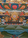 This beautiful 24.5” x 19.25” Medicine Buddha Tibetan Thangka Painting has his left hand, lying in his lap in ‘Meditation’ Mudra, which holds a bowl containing medicine nuts, while his right hand is in ‘Charity’ Mudra which holds the branch of the Myrobalan plant, a medicinal plant found in Nepal, India and other tropical countries. Medicine Buddha wears the monastic robe and is seated with the legs crossed. Medicine Buddha sits on a moon disk on lotus petals.