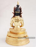 Aparmita is the name given to Amitabha in his character of bestower of longevity. Aparmita may be turned either a “Crowned Buddha or a Bodhisattva and is therefore richly clad and wears the thirteen ornaments. His hair is painted blue and falls on either side to his elbows or may be curiously coiled. Aparmita is seated like Buddha and his hands lie on his lap in Dhyana Mudra holding the ambrosia vase, his special emblem. The vase is richly decorated and from the cover fall four strings of beads which represent sacred pills. In the preliminary worship, the pills made from buttered dough and the ambrosia brewed from spirit or beer and offered in a skull bowl to the great image of Aparmita. The lama then places a vajra on the ambrosia vase, which the image of Amitayus holds in its lap, and applies a cord, which is attached to the vajra, his own heart. The wine in the ambrosia vase is then consecrated and the people partake of it as well as of the sacred pills with the firm conviction that there lives will be prolonged through their faith in Aparmita.