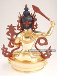 Manjushri is known as the Bodhisattva of Wisdom and is the bodhisattva counterpart to Adi Buddha (Thogmai Sangye), the Primordial Buddha. Manjushri is the tutelary deity of astrology and generally the protector of students. Manjushri is often considered to be the Buddha's incarnate wisdom. In his right hand Manjushri holds the flaming double sword of analytic discrimination to annihilate ignorance, the fundamental cause of cyclic existence and suffering. The left hand holds a blue lotus surmounted by the book of transcendent wisdom, the Prajnaparamita sutra. Manjushri is surrounded by over a hundred similar golden manifestations, symbolizing the universality of the Bodhisattva of Wisdom. Manjushri, whose worship confers mastery of the Dharma and he is considered the founder of Kathmandu. Originally, the Kathmandu valley was a lake where Vipaswi Buddha threw some lotus seeds. One of these seeds grew into a thousand petalled lotus flower from which shone a five colored light representing the five Buddhas. With his flaming sword of wisdom, Manjushri cut through the valley walls and the light came to rest on the peak at Swayambhu.