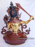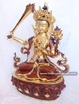 This large 24” Manjushri Partially Gold Gilded Sculpture is made from Copper Alloy which is crafted by the experienced artisan of Patan, Nepal who has been in this business for generations.
