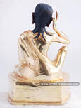 In this 6.75” Guru Milarepa is shown in a cotton clad dress seated on antelope skin with Lalitasana posture. Guru Milarepa wears a meditation band. His right hand is generally put on the ears symbolizing that he is listening to the voices of beings in lower realms. He has great compassion for them and sentient beings in general. His body is usually blue or green in color. It is said that during his meditation he ate nothing but nettles for the long period of time and his skin thus assumed a greenish hue. Sometimes to represent his realizations, his body is depicted golden in color too.