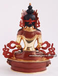Aparmita is the name given to Amitabha in his character of bestower of longevity. Aparmita may be turned either a “Crowned Buddha or a Bodhisattva and is therefore richly clad and wears the thirteen ornaments. His hair is painted blue and falls on either side to his elbows or may be curiously coiled. Aparmita is seated like Buddha and his hands lie on his lap in Dhyana Mudra holding the ambrosia vase, his special emblem. The vase is richly decorated and from the cover fall four strings of beads which represent sacred pills. In the preliminary worship, the pills made from buttered dough and the ambrosia brewed from spirit or beer and offered in a skull bowl to the great image of Aparmita. The lama then places a vajra on the ambrosia vase, which the image of Amitayus holds in its lap, and applies a cord, which is attached to the vajra, his own heart. The wine in the ambrosia vase is then consecrated and the people partake of it as well as of the sacred pills with the firm conviction that there lives will be prolonged through their faith in Aparmita.