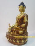This medicine buddha statue is copper casted in half gold repoused.. The Medicine Buddha statue holds a blooming myrobalan plant in his left hand, and his right hand is in the mudra (or gesture) of bestowing a gift. Tibetan Buddhists believe that the knowledge of the myrobalan plant was a gift from the Buddha, as it can help heal physical and mental diseases. They liken its ability to heal and protect to that of the Dharma, or teachings of the Buddha.