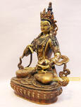 This beautiful 8” is shown in white, signifying his immaculate purity in Dhyana asana. Vajrasattva right hand holds the vajra at the level of his heart while his left hand clasps the bell. The bell is said to symbolize wisdom and the vajra signifies the means of utilizing this wisdom. Together the vajra and the bell symbolize the fusion of all polarities, including masculine and feminine qualities, in one Enlightened experience.