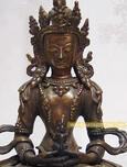Aparmita is the name given to Amitabha in his character of bestower of longevity. Aparmita may be turned either a “Crowned Buddha or a Bodhisattva and is therefore richly clad and wears the thirteen ornaments. His hair is painted blue and falls on either side to his elbows or may be curiously coiled. Aparmita is seated like Buddha and his hands lie on his lap in Dhyana Mudra holding the ambrosia vase, his special emblem. The vase is richly decorated and from the cover fall four strings of beads which represent sacred pills. In the preliminary worship, the pills made from buttered dough and the ambrosia brewed from spirit or beer and offered in a skull bowl to the great image of Aparmita. The lama then places a vajra on the ambrosia vase, which the image of Amitayus holds in its lap, and applies a cord, which is attached to the vajra, his own heart. The wine in the ambrosia vase is then consecrated and the people partake of it as well as of the sacred pills with the firm conviction that there lives will be prolonged through their faith in Aparmita.