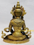 Aparmita is the name given to Amitabha in his character of bestower of longevity. Aparmita may be turned either a “Crowned Buddha or a Bodhisattva and is therefore richly clad and wears the thirteen ornaments. His hair is painted blue and falls on either side to his elbows or may be curiously coiled. Aparmita is seated like Buddha and his hands lie on his lap in Dhyana Mudra holding the ambrosia vase, his special emblem. The vase is richly decorated and from the cover fall four strings of beads which represent sacred pills. In the preliminary worship, the pills made from buttered dough and the ambrosia brewed from spirit or beer and offered in a skull bowl to the great image of Aparmita. The lama then places a vajra on the ambrosia vase, which the image of Amitayus holds in its lap, and applies a cord, which is attached to the vajra, his own heart. The wine in the ambrosia vase is then consecrated and the people partake of it as well as of the sacred pills with the firm conviction that there lives will be prolonged through their faith in Aparmita.
