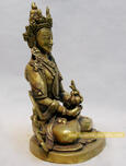 In this 6” Aparmita Sculpture Aparmita is seated like Buddha and his hands lie on his lap in Dhyana Mudra holding the ambrosia vase, his special emblem. The vase is richly decorated and from the cover fall four strings of beads which represent sacred pills. Aparmita wears the thirteen ornaments and his hair is painted blue and falls on either side to his elbows or may be curiously coiled.