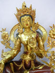 Half gold repousse copper alloy 24” Green Tara sculpture features the Green Tara seated on lotus and cast with copper alloy in Patan Nepal.