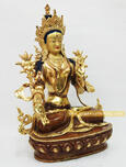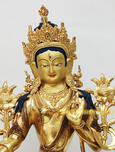 White Tara mean one who save, This White Tara Statue is made of the high quality copper gilded with 24 K half gold. This White Tara Statue in full meditation posture seated on lotus has intricate designs that make it a priceless item.