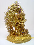 This Beautiful 11.5” Yamantaka With Consort cast in copper with full 24 k pure gold plated. This Yamantaka with consort displays the 34-armed, 16-legged form of Yamantaka, Conqueror Of Death. He has nine heads, the principal one of a bull with long pointed horns, the other eight mounted on the back of his crown which is ornamented with skulls. His red hair stands on end "with scorpion-sting shaped tips." His mouth is open to reveal fangs and a lolling tongue seeking blood and other tastes. The eyes are large and protruding, a third eye located at the center of the forehead. The eyebrows are angrily knitted and raised. At the apex of the crown above the head of a garuda is a peaceful head of the Bodhisattva Manjusri, of whom Yamantaka is the ferocious emanation.