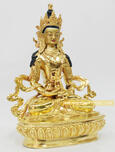In this 9” Aparmita Sculpture Aparmita is seated like Buddha and his hands lie on his lap in Dhyana Mudra holding the ambrosia vase, his special emblem. The vase is richly decorated and from the cover fall four strings of beads which represent sacred pills. Aparmita wears the thirteen ornaments and his hair is painted blue and falls on either side to his elbows or may be curiously coiled.