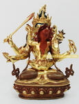 Manjushri is known as the Bodhisattva of Wisdom and is the bodhisattva counterpart to Adi Buddha (Thogmai Sangye), the Primordial Buddha. Manjushri is the tutelary deity of astrology and generally the protector of students. Manjushri is often considered to be the Buddha's incarnate wisdom. In his right hand Manjushri holds the flaming double sword of analytic discrimination to annihilate ignorance, the fundamental cause of cyclic existence and suffering. The left hand holds a blue lotus surmounted by the book of transcendent wisdom, the Prajnaparamita sutra. Manjushri is surrounded by over a hundred similar golden manifestations, symbolizing the universality of the Bodhisattva of Wisdom. Manjushri, whose worship confers mastery of the Dharma and he is considered the founder of Kathmandu. Originally, the Kathmandu valley was a lake where Vipaswi Buddha threw some lotus seeds. One of these seeds grew into a thousand petalled lotus flower from which shone a five colored light representing the five Buddhas. With his flaming sword of wisdom, Manjushri cut through the valley walls and the light came to rest on the peak at Swayambhu.