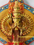 In this form, Avalokiteshvara Bodhisattva has eleven heads. There are three rows of three heads which are in the color of white (sambhogakaya), green (nirmanakaya), and red (dharmakaya). This represents the three principle aspects of buddhahood. Above these three rows is a blue wrathful face of Vajrapani and the red face of Amitabha. In this form, Avalokiteshvara has eight main hands. The two central hands are held in a cupped gesture symbolizing an attitude of homage (In some depiction, these two hands holds a wish fulfilling jewel). Another main hand is held in an open – palm gesture symbolizing generosity. The other main hands hold five objects: a bow and arrow, lotus, vase, rosary, and eight – spooked wheel. The bow and arrow represents bodhisattva's ability to aim at the heart of all beings. The vase contains the nectar of immortality. The lotus blossom represents enlightenment. The eight – spooked wheel represents the Buddha's teaching. The aura around the painting represents his one thousand hands and symbolizing his inexhaustible compassion. In each of his hand, there is an eye (wisdom) in the center of the palm (skills) which symbolizes the union of wisdoms and skills. |