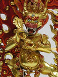 Yamantaka, the ferocious emanation of Manjushri (Bodhisattva of wisdom), is the most complicated and terrible of all the wrathful Buddhist divinities. Under this from he conquered the demon king of death, Yama, who was depopulating Tibet in his insatiable thirst for victims. According to this myth, in his paroxysm of insight, Manjushri traveled all the way to the underworld to seek out Yama, the God of death, who dwells with all his minions in the sealed up iron cities of hell. Yama appears in Indian mythology with the head of a water buffalo. To tame Yama, Manjushri adopted the same form, adding to it eight other faces and a multiple array of arms, each holding fearful and deadly weapons. He further sprouted a corresponding number of legs, and surrounded himself with a vast host of terrifying beings. To confront death, he thus manifested the form of death itself, magnified to infinity. Death (Yama) saw himself endlessly mirrored back to himself, infinitely outnumbered by himself. Death was literally scared to death. Thus the yogi who meditates through the imagery of Yamantaka intends and hopes to develop a sense of identity strong enough to face down death, and the fear that attends upon it. Each head, each limb, each attribute, symbol and ornament of Yamantaka expresses the total mobilization of the faculties of enlightenment needed for this ultimate confrontation. Both Yama and Yamantaka are represented with bull’s heads, but Yama always has an ornament, shaped like a wheel on his breast, which is his distinctive mark.