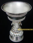 7.5” Silver Butter Lamp a Buddhist Ritual Item made of Pure Silver. 7.5” Silver Butter Lamp a Buddhist Ritual Item is beautifully hand carved with beautiful and intricate designs and has a Kalash at the center of the Butter Lamp with four leaves rolled down from the Kalash which also makes it a wonderful show piece.