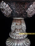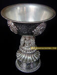 9.5” Silver Butter Lamp a Buddhist Ritual Item made from Silver and has intricate and beautiful hand carved designs of auspicious symbols, Kalsh at the center of the Silver Butter Lamp and other beautiful designs all over the Silver Butter Lamp that make this Buddhist Ritual Item 9. 5” Silver Butter Lamp a priceless item.