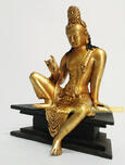 This 8" Bodhisattva is made from Copper alloy with 24 Karat Full Gold Gilded and is made by the experienced artisans from Patan, Nepal. This 8" Fully Gold Gilded Bodhisattva Copper Sculpture has wooden base and is beautiful piece of art.