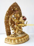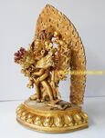 Fully Gold Gilded 10.5” Chakrasamvara with Vajravarahi is made from Copper with 24 Karat Gold has very fine and excellently carved which is crafted by the experienced artisan from Patan, Nepal who has been in this business from generations.