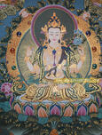 Chenresi is an enlightened being who is a manifestation of all Buddhas' compassion. Chenresi is known the 'Buddha of Compassion'. Chenresi usually appears as white in color with four arms. His first two hands are pressed together at his heart, symbolizing his respect for his Spiritual Guide, Buddha Amitabha, who is on his crown. Even though Chenresi is an enlightened being he still shows respect to his Spiritual Guide. His first two hands hold a jewel, which symbolizes his own enlightenment. This mudra is indicating 'I attained jewel-like great enlightenment through receiving blessings from my Spiritual Guide Amitabha'.