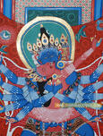 Semi – wrathful in appearance, blue in colour, he has four faces, twenty – four hands and two legs. The main face is blue, right red, left white and the back face is yellow. Each has three eyes and an open mouth with slightly bared fangs. The first set of eight hands is blue in color, second (middle) red and third (upper) yellow. The first pair of hands holds a vajra and bell crossed at the heart embracing the consort. The remaining right hands hold a sword, curved knife, trident, three arrows, vajra hook, damaru drum, hammer, wheel, spear, club and axe. The left hands hold a shield, katvanga staff, skullcup, bow, lasso, jewel, lotus, conch shell, mirror, vajra chains and the four-faced yellow head of Brahma. The Lord wears a long green scarf and a tiger skin as a lower garment. The consort, Vishvamata, is yellow, with four faces and eight hands. They are both adorned with crowns, necklaces, earrings, bracelets and various ornaments. The right leg of the Lord is straight and red, standing atop the figure of red Kamadeva. The left is bent and white, standing atop white Rudra. Above the layered discs of a white moon, red sun and dark blue Rahu (eclipse) they stand on a multi-colored lotus blossom seat wreathed by the circular orange rays of pristine awareness fire. |