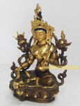 This beautifully carved 9.2” Green Tara Sculpture is made from Copper Alloy with 24 Karat Partially Gold Gilded which is crafted by our experienced artisan of Patan, Nepal who has been in this business from generations.