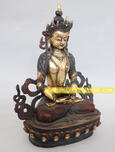 In this 9.5” Aparmita Sculpture Aparmita is seated like Buddha and his hands lie on his lap in Dhyana Mudra holding the ambrosia vase, his special emblem. The vase is richly decorated and from the cover fall four strings of beads which represent sacred pills. Aparmita wears the thirteen ornaments and his hair is painted blue and falls on either side to his elbows or may be curiously coiled.