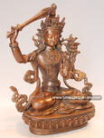 Manjushri is known as the Bodhisattva of Wisdom and is the bodhisattva counterpart to Adi Buddha (Thogmai Sangye), the Primordial Buddha. Manjushri is the tutelary deity of astrology and generally the protector of students. Manjushri is often considered to be the Buddha's incarnate wisdom. In his right hand Manjushri holds the flaming double sword of analytic discrimination to annihilate ignorance, the fundamental cause of cyclic existence and suffering. The left hand holds a blue lotus surmounted by the book of transcendent wisdom, the Prajnaparamita sutra. Manjushri is surrounded by over a hundred similar golden manifestations, symbolizing the universality of the Bodhisattva of Wisdom. Manjushri, whose worship confers mastery of the Dharma and he is considered the founder of Kathmandu. Originally, the Kathmandu valley was a lake where Vipaswi Buddha threw some lotus seeds. One of these seeds grew into a thousand petalled lotus flower from which shone a five colored light representing the five Buddhas. With his flaming sword of wisdom, Manjushri cut through the valley walls and the light came to rest on the peak at Swayambhu.