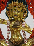 Vajrapani is the embodiment of power of Lord Buddha’s compassion. Vajrapani is always depicted in wrathful aspect. Vajrapani’s body is blue in color and his hair having yellow ochre. Vajrapani wears a tiger skin around his waist and is usually depicted in two arms aspect but can be seen in four arms aspect too. Vajrapani is a major Bodhisattva easily recognized as holding vajra with his right hand and left hand displaying threatening vitarka mudra. His body seems to be massive and in a pose of warrior. Under his feet he controls two live snakes. Vajrapani wears all sorts of bodhisattva ornaments and also a garland of snakes. He has a wide and wild roaring mouth rimmed with lacquered red lips. His eyebrows are like the flame and moustache and beard being curled.