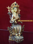 Maitreya's appearance will mark a great turning point in the fortunes of this world. As more and more beings follow his example, their store of merit, and consequently their lifespan, will increase. Eventually people will live in health for such a long time that the sufferings of old age and death will scarcely be known. At that time, their observance of morality will grow lax as people become more and more involved in the pleasures of their existence. With this laxity will come another gradual shortening and degeneration of their lifespan until eventually beings once again will become suitable ripe to take sincere interest in the spiritual path. When the human lifespan as increased again to many thousands of years, and when the planet will be entirely dominated by a benevolent wheel – turning sovereign (Chakravartin) named Shankha, it is at this time that Maitreya Buddha will descend from the Tushita Buddha field (devaloka) where he now resides, to appear in this world as the fifth founding Buddha of this world age. Maitreya will be born the son of a Brahmin priest, and will renounce the world and attain enlightenment in a single day, not requiring six long years. The world in this time will be politically neutralised, and therefore the warrior class and its martial virtues will be obsolete. Thus he will be born among the intellectuals, the priests, and his teaching will bring the gentler emotions to the fore. Maitreya Buddha is supposed to be passing the life of a Bodhisattva in the Tusita (Tushita) Heaven preparatory to his descent to earth in Human form. It is said that he will come to earth full 4000 years after the disappearance of Gautam Buddha for the deliverance all sentient beings. Maitreya may be represented as a standing figure adorned with rich ornaments and holding in his right hand the stalk of a lotus. Maitreya may also be represented seated as a Buddha, with legs either interlocked or dangling down. His color is yellow, and his images sometimes bear the figures of Dhyani Buddhas.